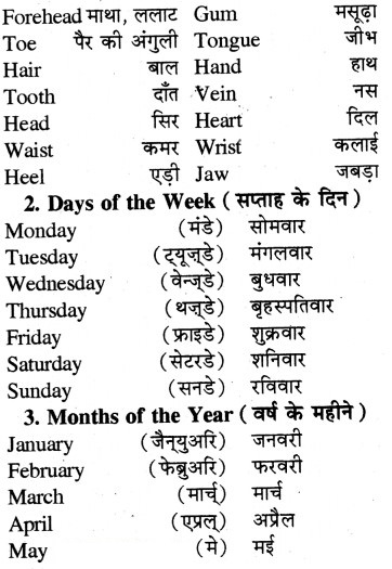 2. आपको उस विषय पर अंग्रेजी में 4-5 वाक्य स्वयं बनाकर बोलने होते हैं। नीचे कुछ प्रमुख विषयों पर संक्षिप्त विवरण दिया जा रहा है। इनका अध्ययन कीजिये। छात्रों की सुविधा के लिए हम इनका हिन्दी अर्थ भी साथ दे रहे हैं।